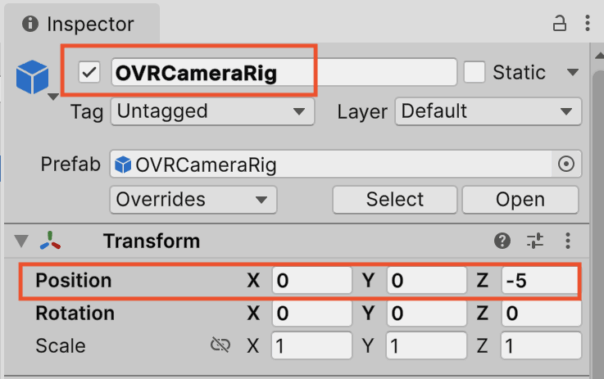 ・「OVRCameraRig」の「Position」を「0, 0, -5」に変更