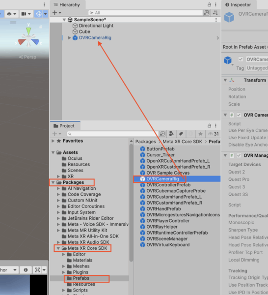 ・「Packages」→「Meta XR Core SDK」→「Prefabs」の中から「OVRCameraRig」を見つけて「Hierarchy」エリアにドラッグ&ドロップ
