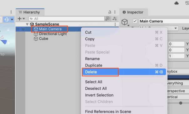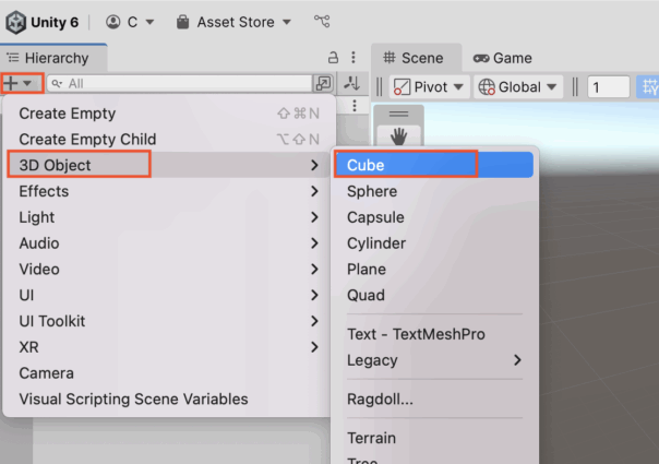 ・「Hierarchy」エリアで「+」→「3D Object」→「Cube」を1つ作成