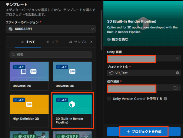 ・「3D(Built-In Render Pipeline)コア」を選択(重要/基礎編・応用編とは使用するテンプレートが異なりますのでご注意ください。)