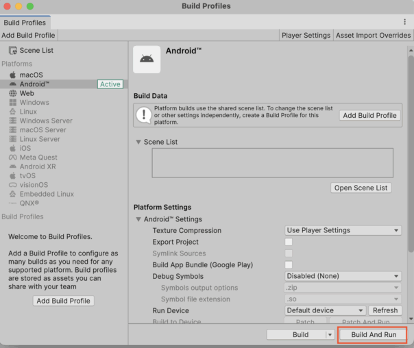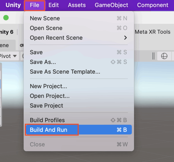 ・「File」→「Build And Run」をクリックして、Meta Questにビルド