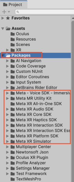 ・Unityが再起動したら、「Packages」フォルダに「Meta」関連のフォルダが入っているのを確認しましょう。