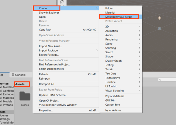 ・Unityの「Assets」エリアの「余白」にカーソルを持ってきて、そこで「右クリック」