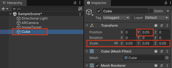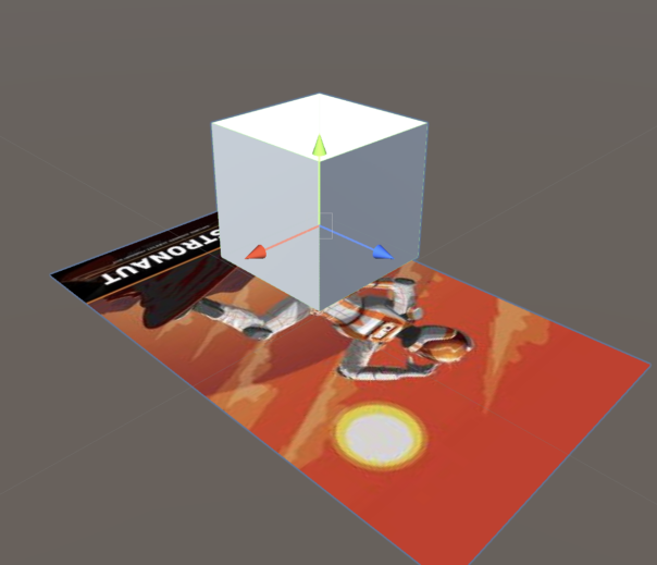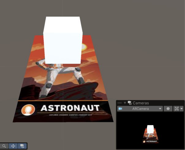 - 印刷したイメージターゲットの上にCubeが浮かんでいれば成功です。(印刷用のPDFデータはプロジェクト内にあり。targetで検索)