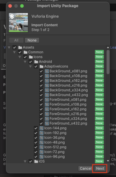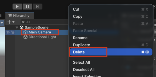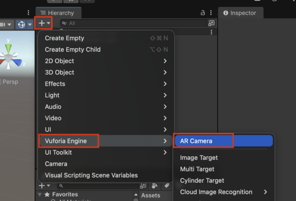 - 「+」・・・>「Vuforia Engine」・・・>「AR Camera」をクリック