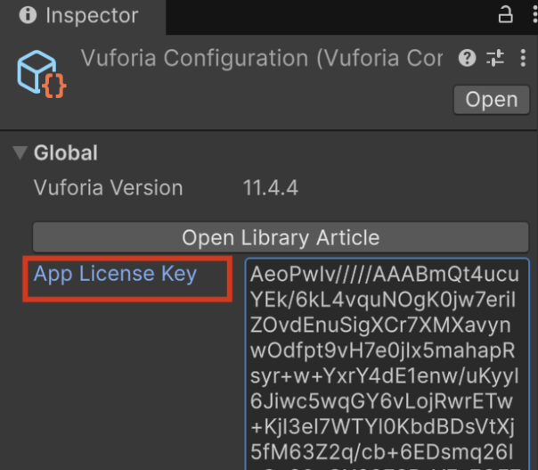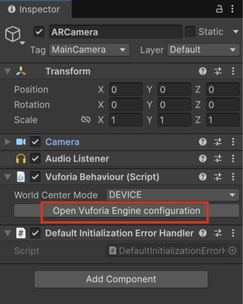 - Inspectorにある「Open Vuforia Engine configuration」ボタンをクリック