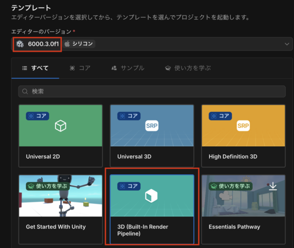 - テンプレートは「3D(Built-In-Render Pipeline」を選択すること(重要)